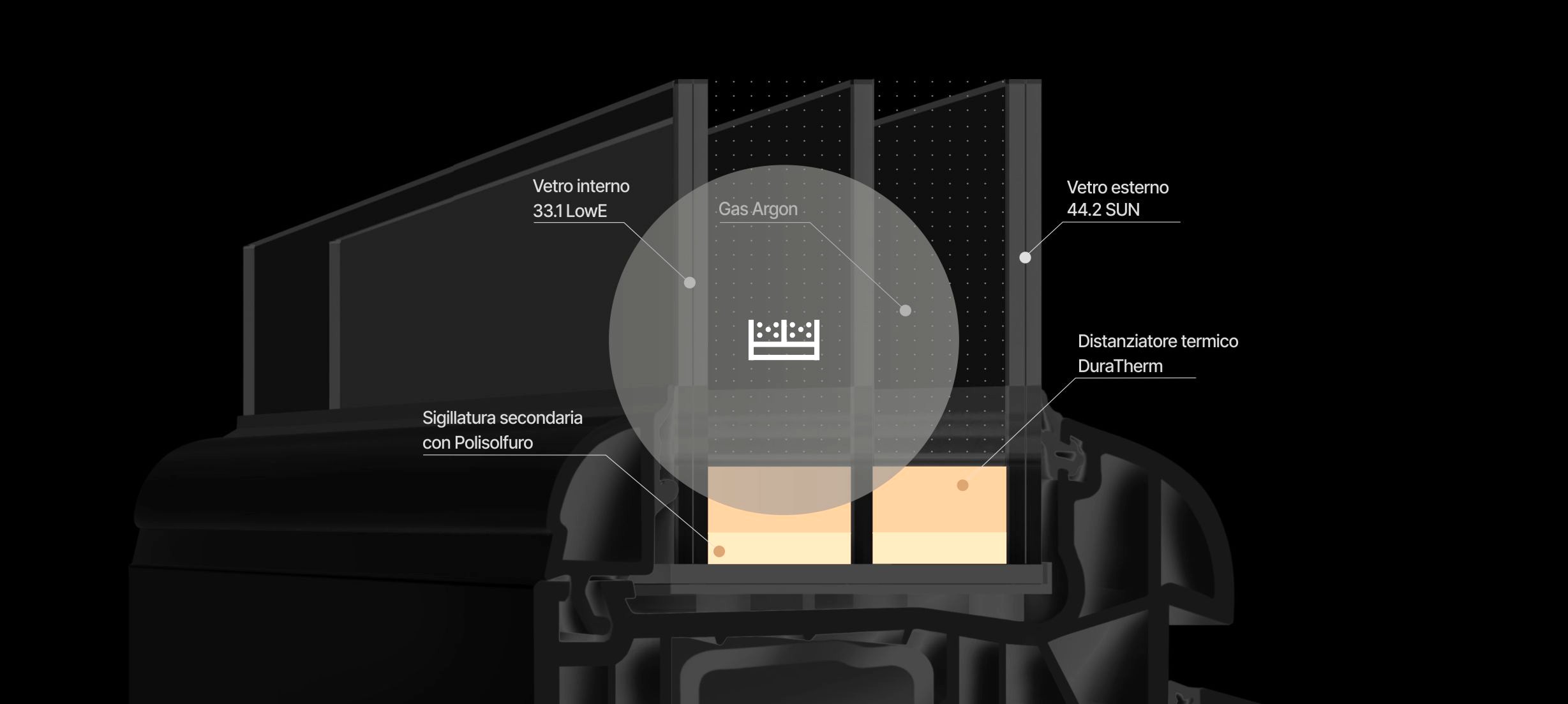 Nella finestra ADF Design, lo spessore del vetrocamera può essere di 52 mm (triplo) o 48 mm (doppio). Il vetro rappresenta l'80% della superficie di una finestra, quindi le proprietà di isolamento termico e acustico delle finestre dipendono in larga misura dalla qualità della vetratura. Il triplo vetro è costituito da tre lastre di vetro che formano camere ermeticamente sigillate con gas inerte (argon) e sono unite da un distanziatore. Questo ha lo scopo di sigillare il pacchetto e impedire il trasferimento di calore dall’interno verso l’esterno e viceversa. Pertanto, è essenziale che il materiale con cui è realizzato il distanziatore abbia una conducibilità più bassa possibile. Le finestre ADF sono equipaggiate di serie con distanziatore Duratherm.